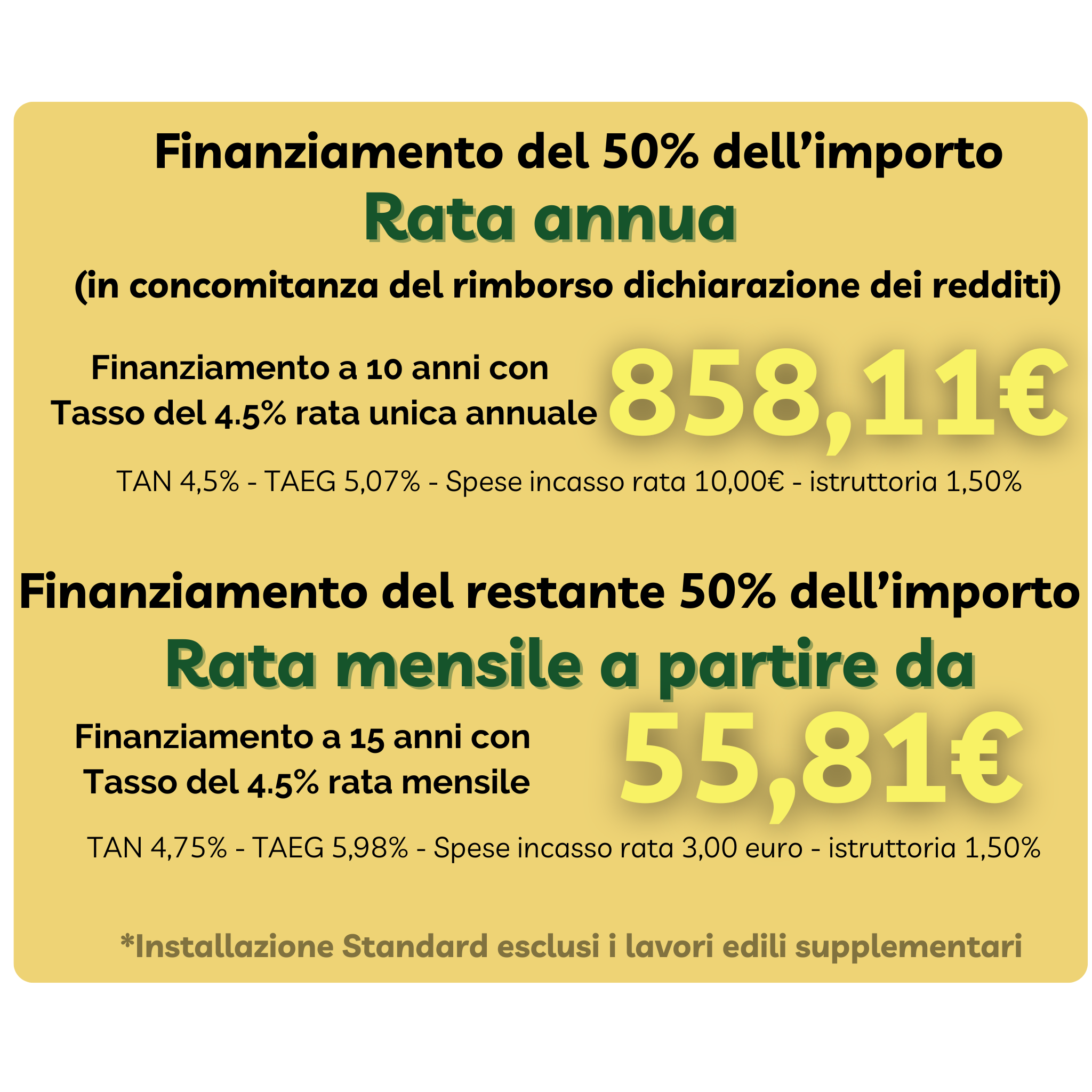 Con un’aliquota IVA agevolata del 10%, forniamo inoltre assistenza preliminare per l’ottenimento delle detrazioni fiscali e seguiamo tutte le pratiche autorizzative, rendendo il passaggio all’energia pulita semplice e conveniente.